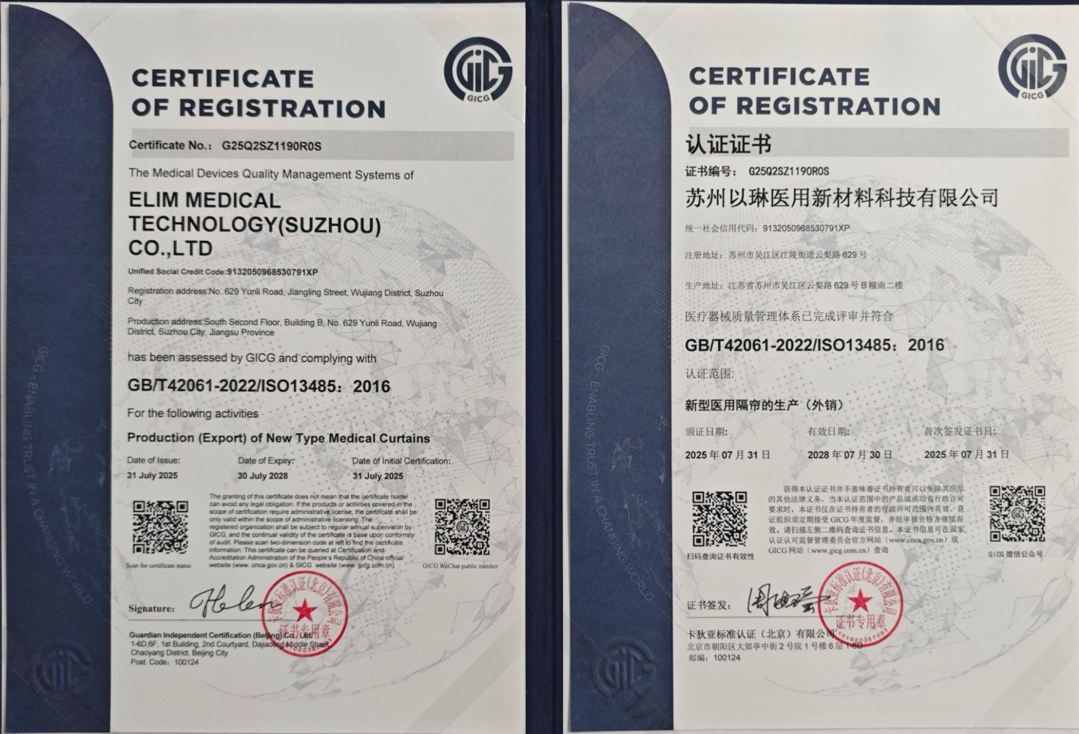 प्रमाणन विशेष रूप से उन्नत चिकित्सा पर्दे (निर्यात के लिए) के उत्पादन को शामिल करता है, जो वैश्विक बाजारों के लिए उच्च गुणवत्ता वाले, आज्ञाकारी चिकित्सा उत्पादों के निर्माण में एलिम मेडिकल की विशेषज्ञता को रेखांकित करता है।